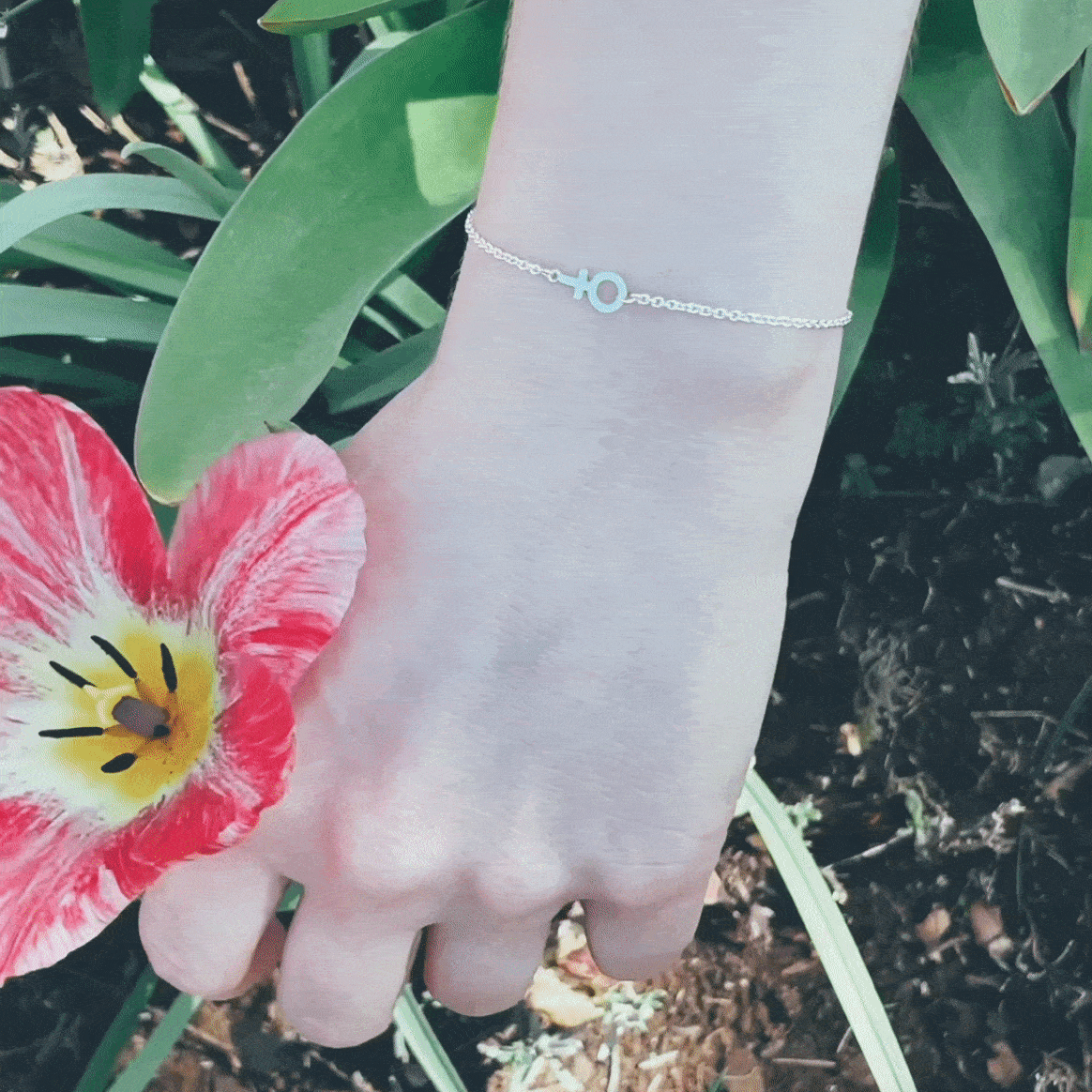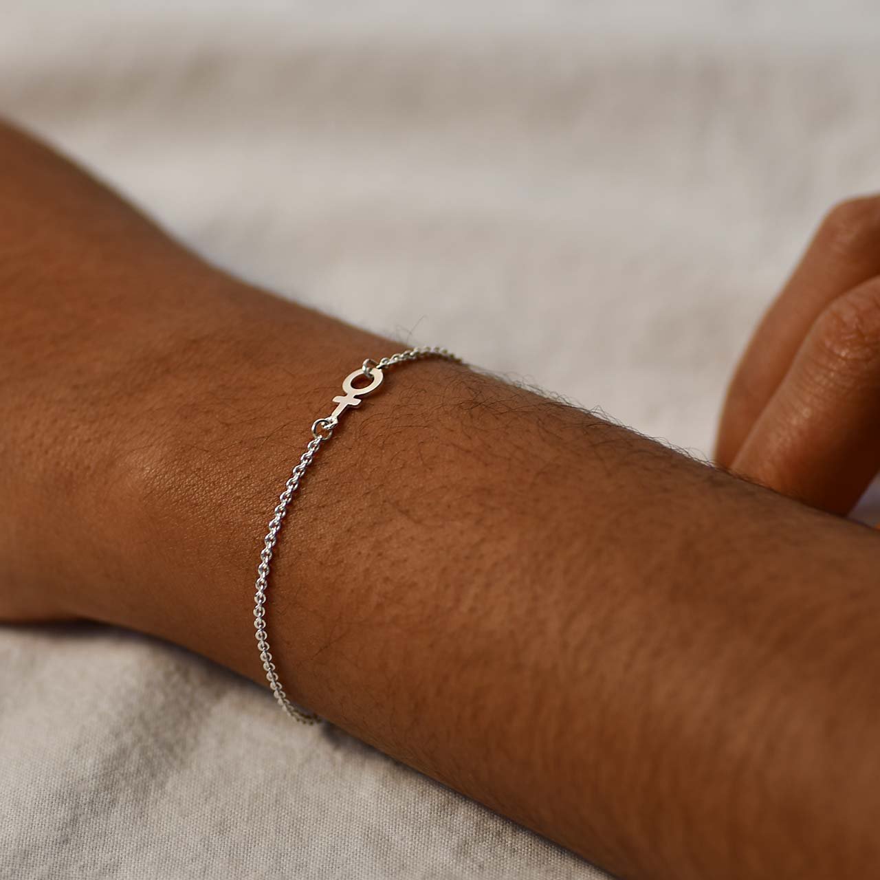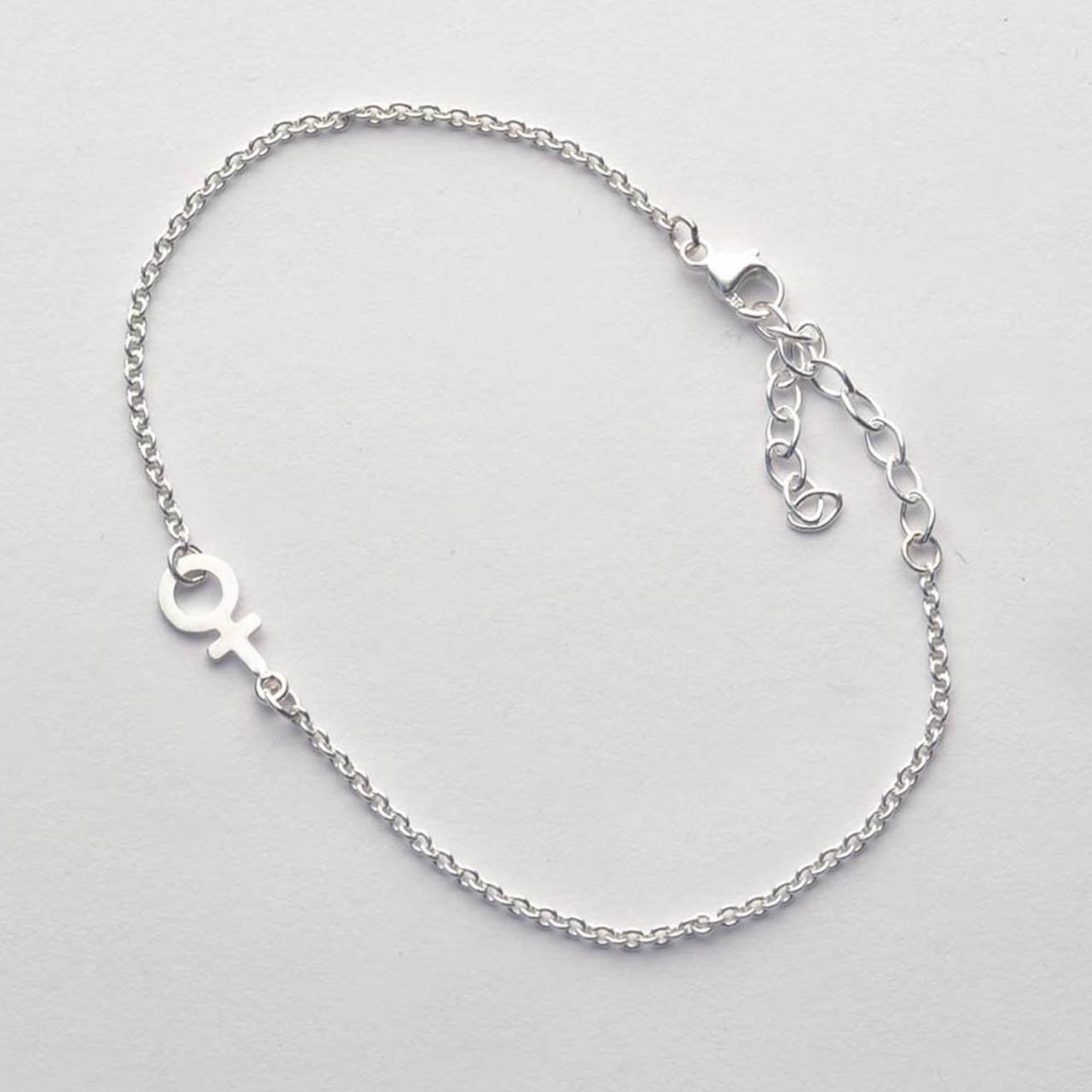 Handmade silver bracelet with a small female symbol measuring 9mm. The chain, which is 1.5mm in diameter, has an extension piece that can be fastened at lengths from 15 to 19 cm.