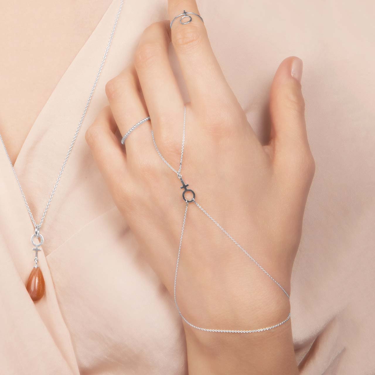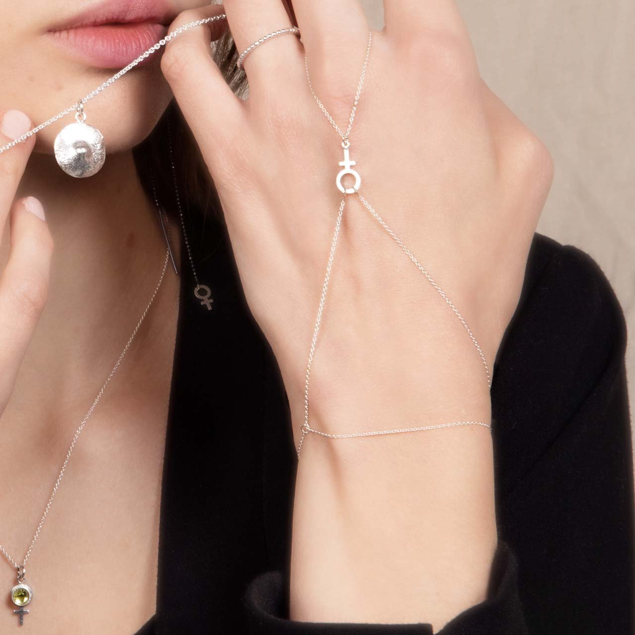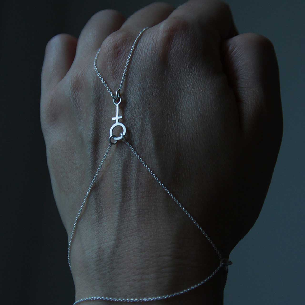 Handmade hand jewelry with a female symbol and chains as a ring and bracelet in 925 sterling silver. Adjustable length 15cm-18cm. Choose between polished silver or black oxidized silver. Comes with instructions :)