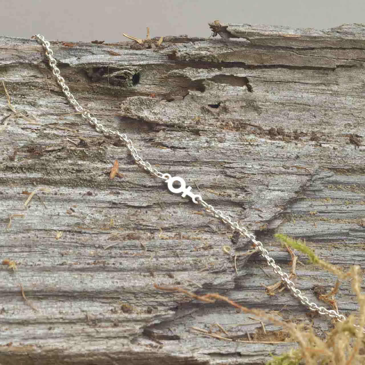 This bracelet with a mini female symbol represents community and the strength of every woman. It is a simple yet powerful expression of feminism, sisterhood, and the force that unites women around the world. Handmade from recycled 925 sterling silver. Both sides are polished. The female symbol measures 6mm Ø. The chain, which is 1.5mm Ø, has an extension piece that can be fastened at lengths from 15 to 19 cm.