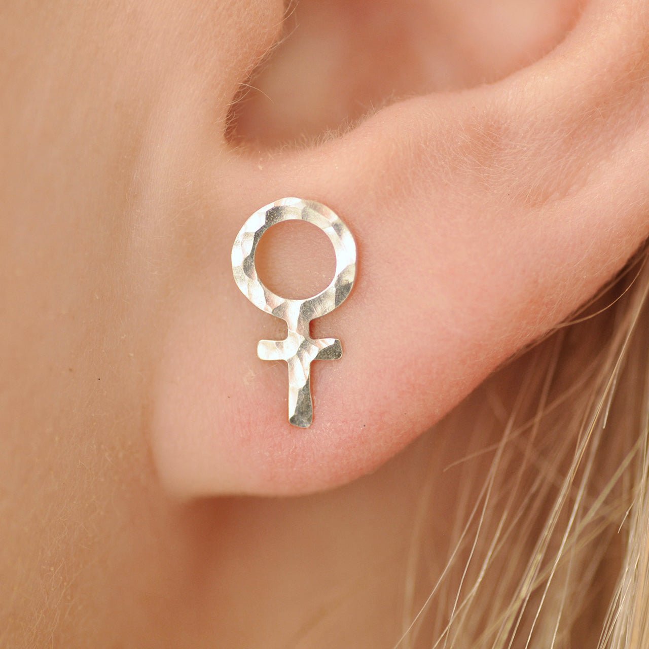 Handmade feminist earrings in sterling silver with a hammered surface measuring approximately 12mm. They become shimmering and lively when light hits the hammered surface. Sold as a pair (2 pcs)