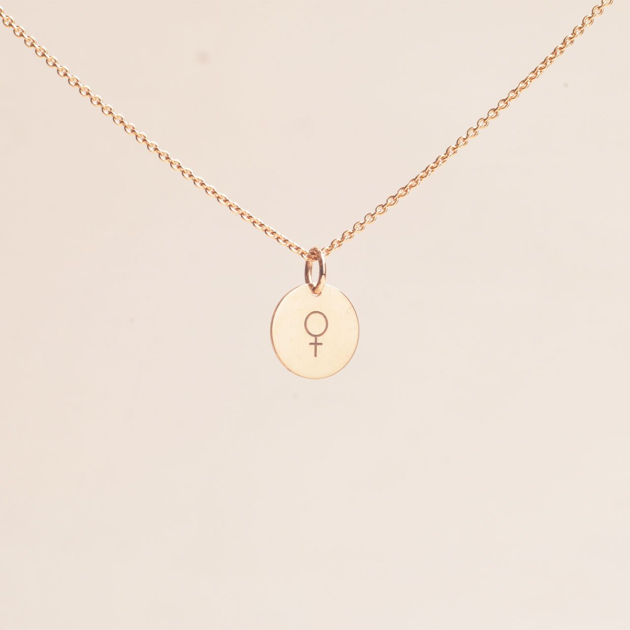Handmade charm in 18k gold with a stamped female symbol. The charm measures 10mm in diameter excluding the loop. Length approximately 14mm including the loop. Sold without chain, add a chain under the -Chains tab. Shown here together with the 0.8mm ø chain in 45cm.