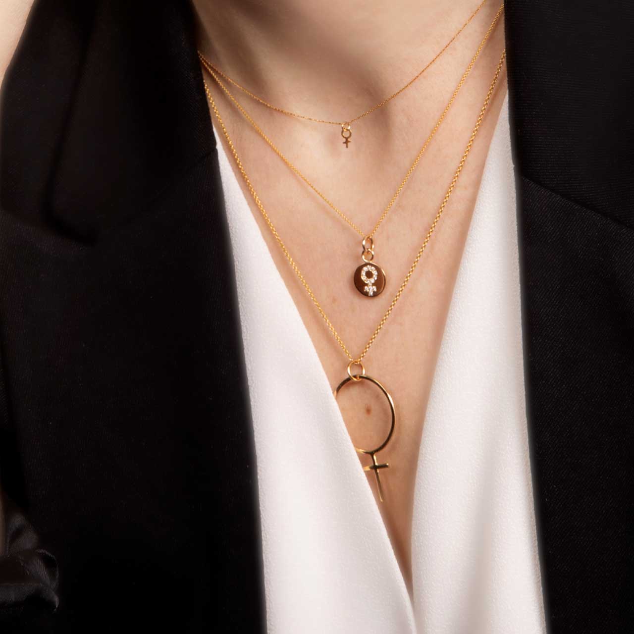 Handmade large feminist pendant in 18k gold. The length of the female symbol measures approximately 35mm. Sold without a chain, scroll down to see gold chains that match. The pendant is shown here together with the 18k gold chain, which is 1mm ø and 42cm long.