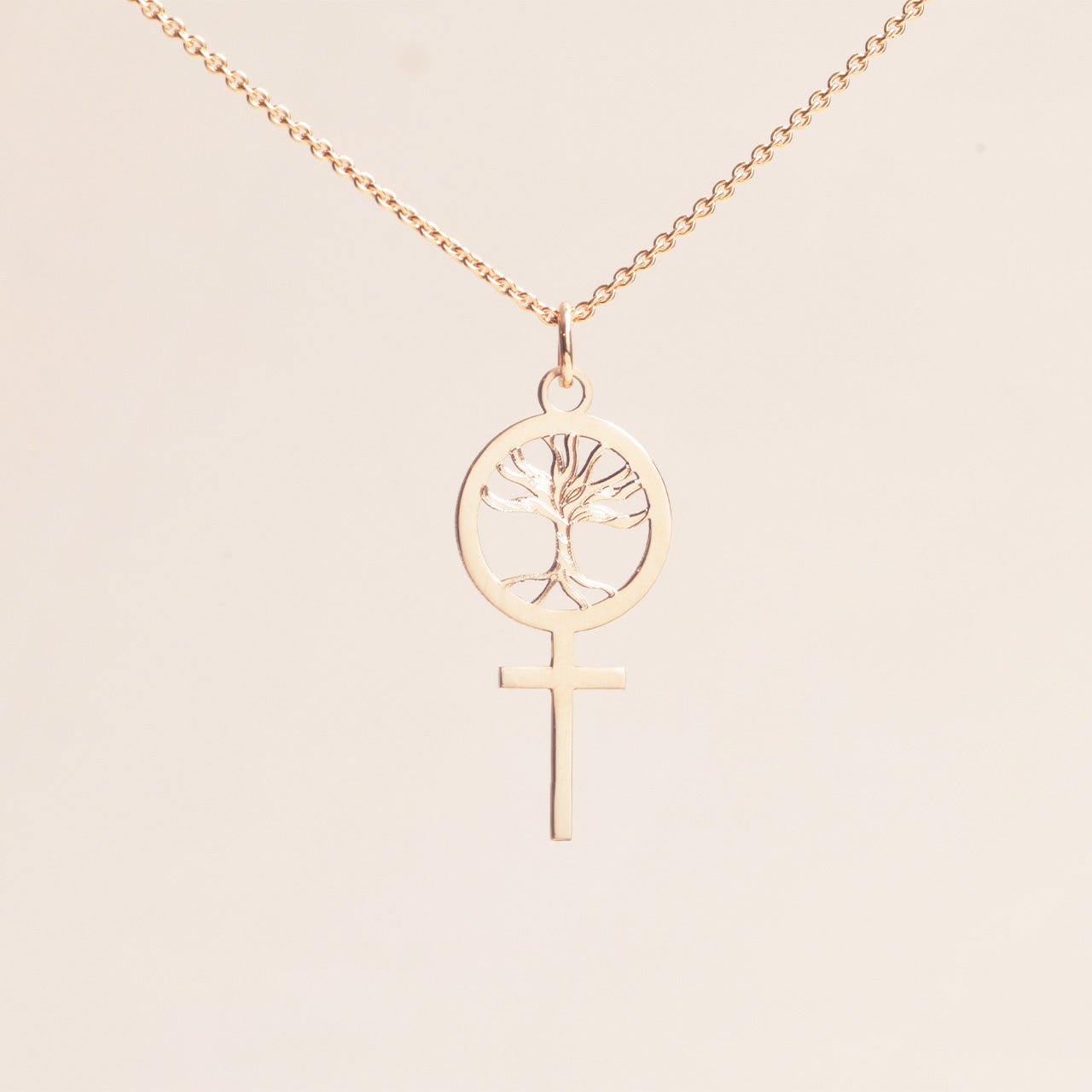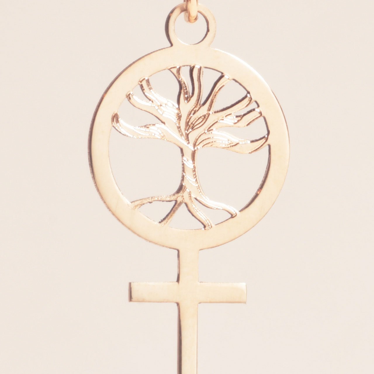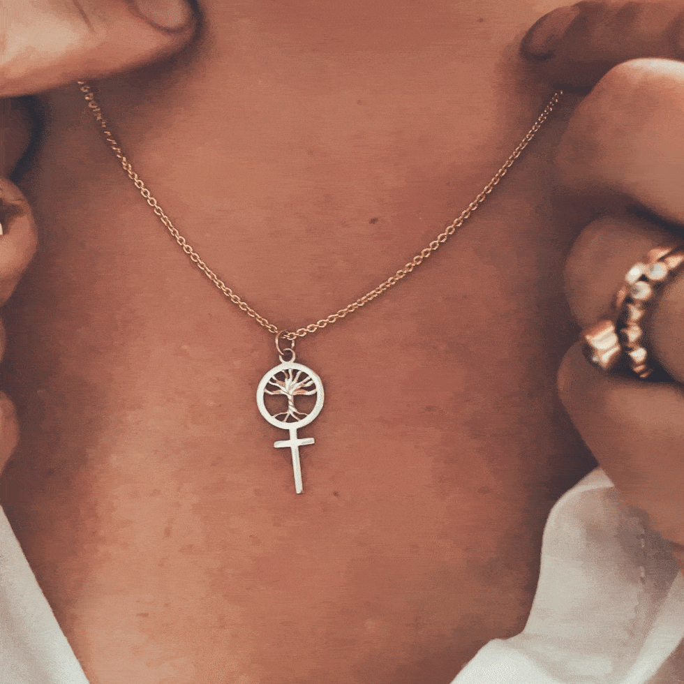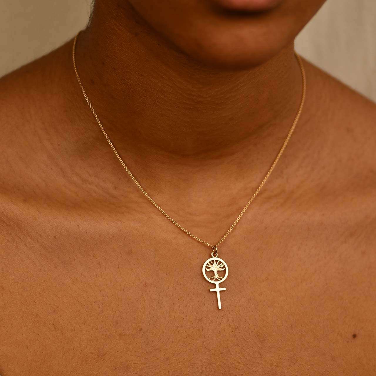 A feminist pendant featuring the tree of life to celebrate the amazing female body! Handcrafted in 18k gold with the "tree's" branches engraved. The jewelry is about 26mm including the loop and is shown here with the 18k gold chain, which is 1mm in diameter.