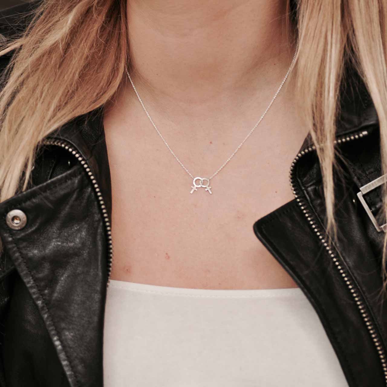 Handmade necklace with double female symbols that interlock freely, featuring a 1mm ø chain adjustable from 42-45cm, all in 925 sterling silver. Lesbian symbol. Choose between polished silver or black oxidized silver.