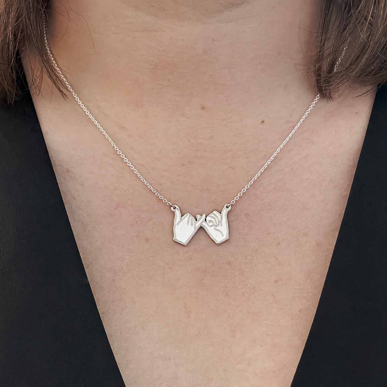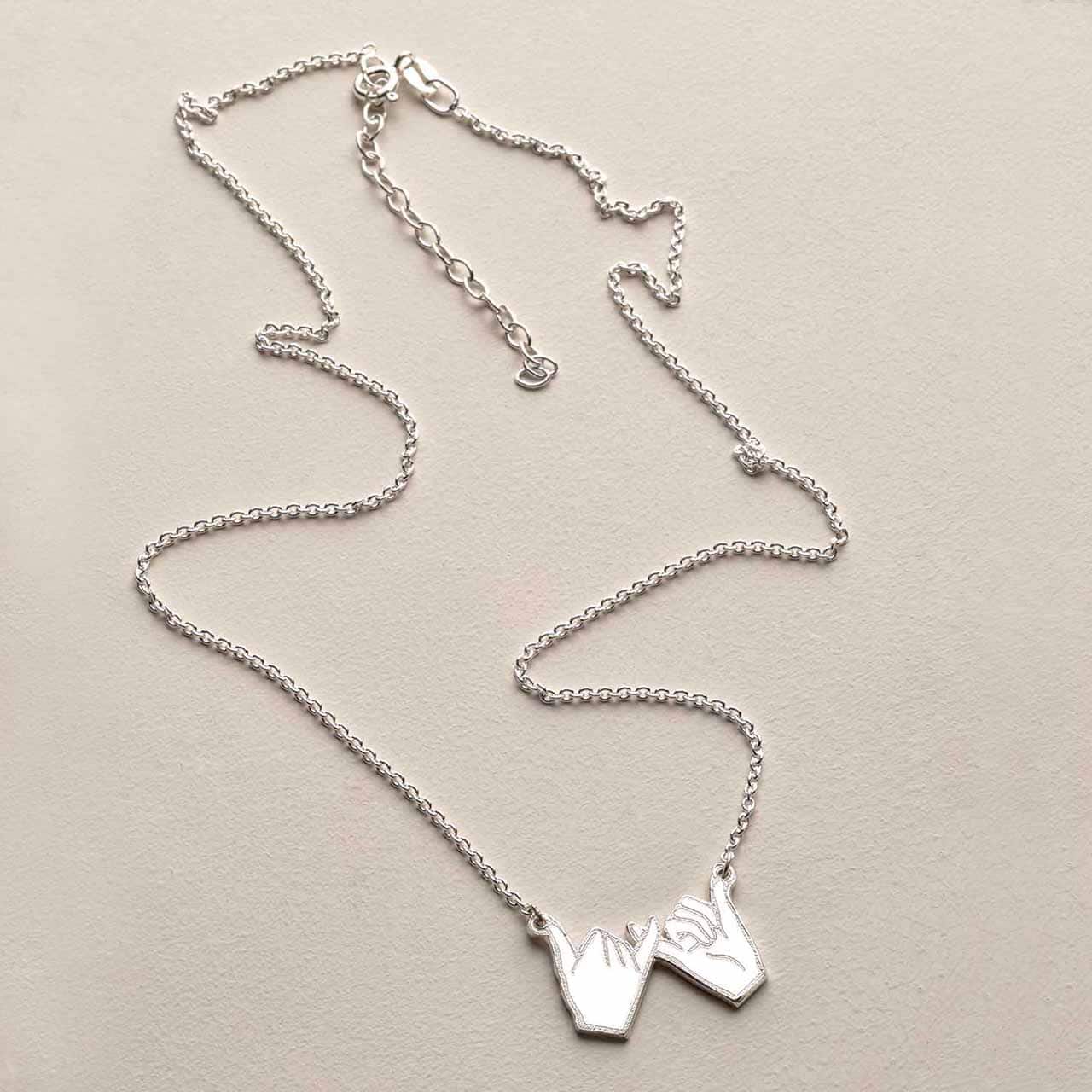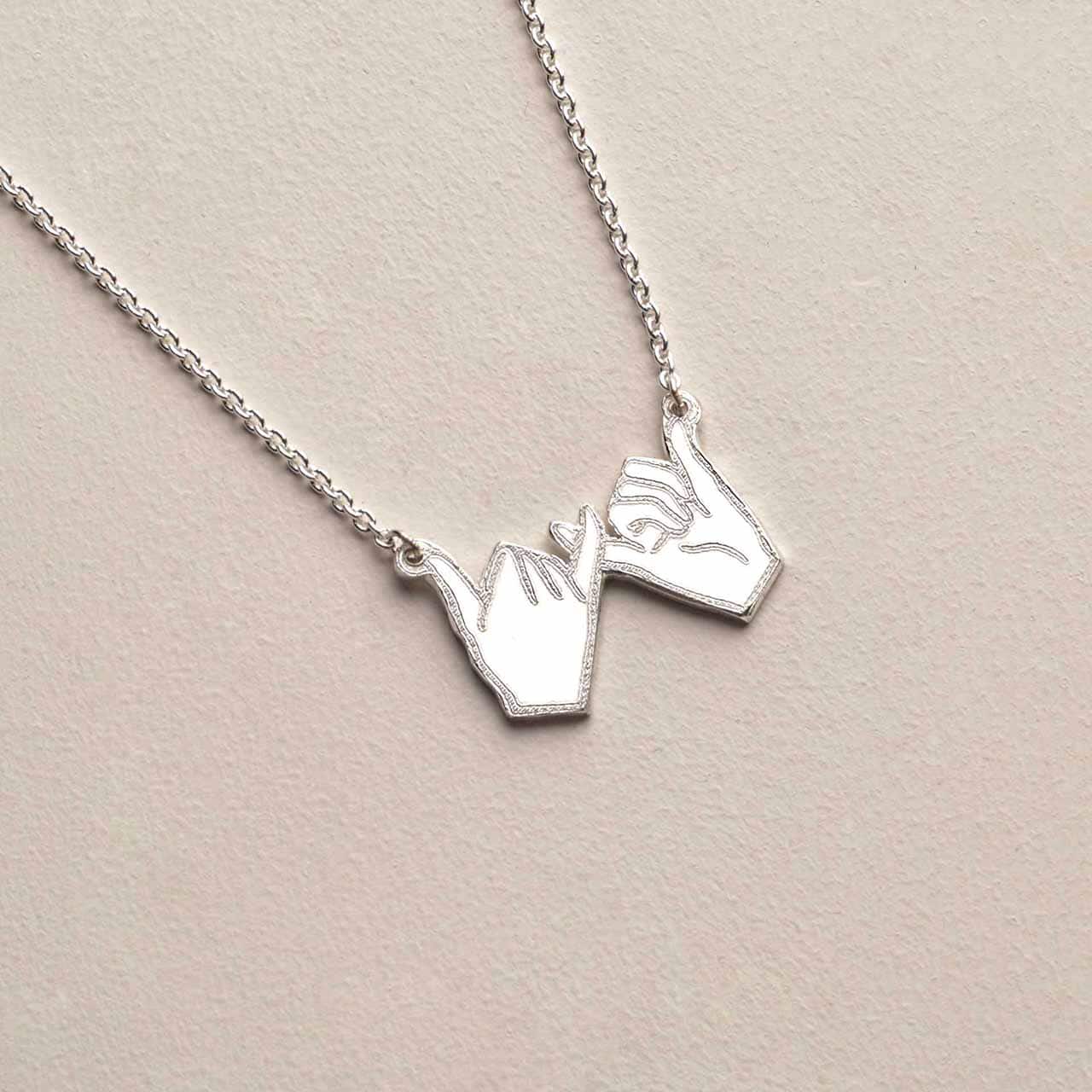 Handmade necklace in sterling silver designed by Hadil Mohamed and created by Feministsmeden for Maktsalongen's 10th anniversary. Pinky Swear: To show that sisterhood is a promise, a promise to always be there for each other. To show that we always support and encourage each other, woman to woman. The hands measure 17x13mm with a chain and extension that can be fastened between 44-49cm.