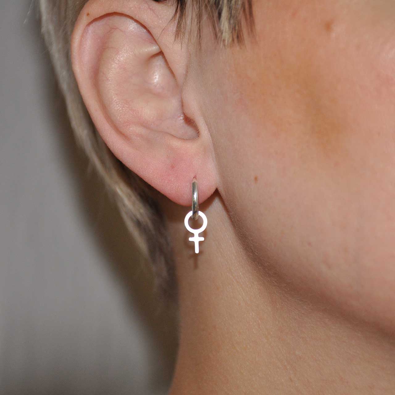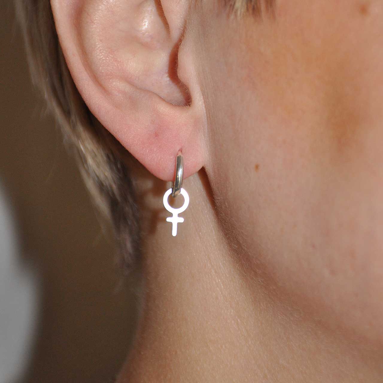 Small but powerful – these hoop earrings with the female symbol are a tribute to our history, our struggle, and our future. Handmade from recycled silver to be an eternal symbol of freedom and sisterhood. Simple enough for everyday wear, strong enough for revolution! Sold in pairs (2 pcs) The hoops are easy to use, opening by pulling them apart and closing with a click, measuring 13mm Ø. The female symbols measure 12mm and can be removed and also used as pendants if desired. All made from recycled 925 sterling silver by a feminist for feminists.