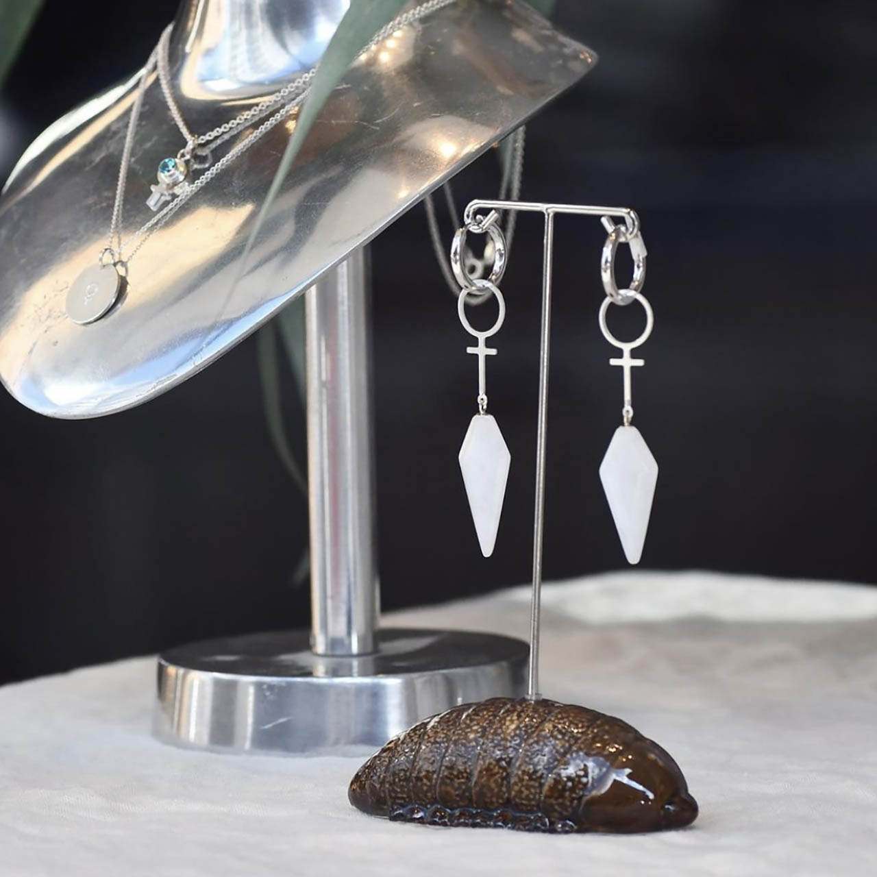 Feminist earrings in sterling silver with shiny female symbols measuring 24mm and the gemstone snow quartz.