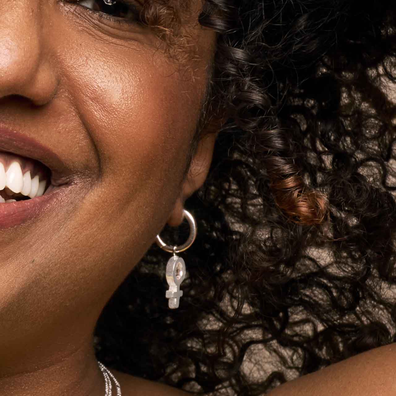The female sign is a bit thicker and hangs on a pair of silver hoops.