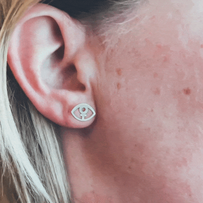 1 stud earring in the shape of an eye with a female symbol as the pupil. Handmade in 925 sterling silver. Measures approx. 12x8mm Note! Only 1 earring, for those who have only one ear piercing or think it's cool to wear a statement earring!