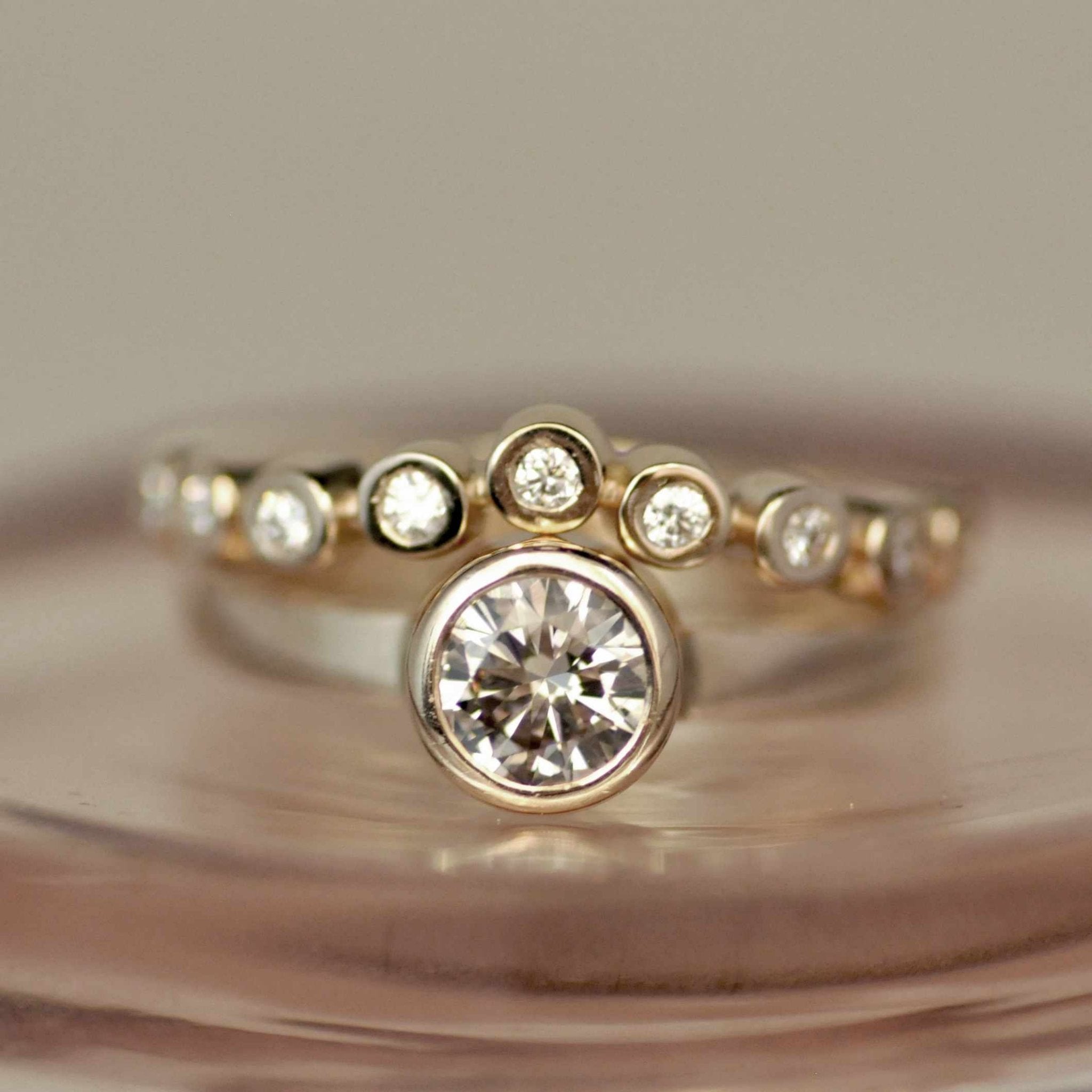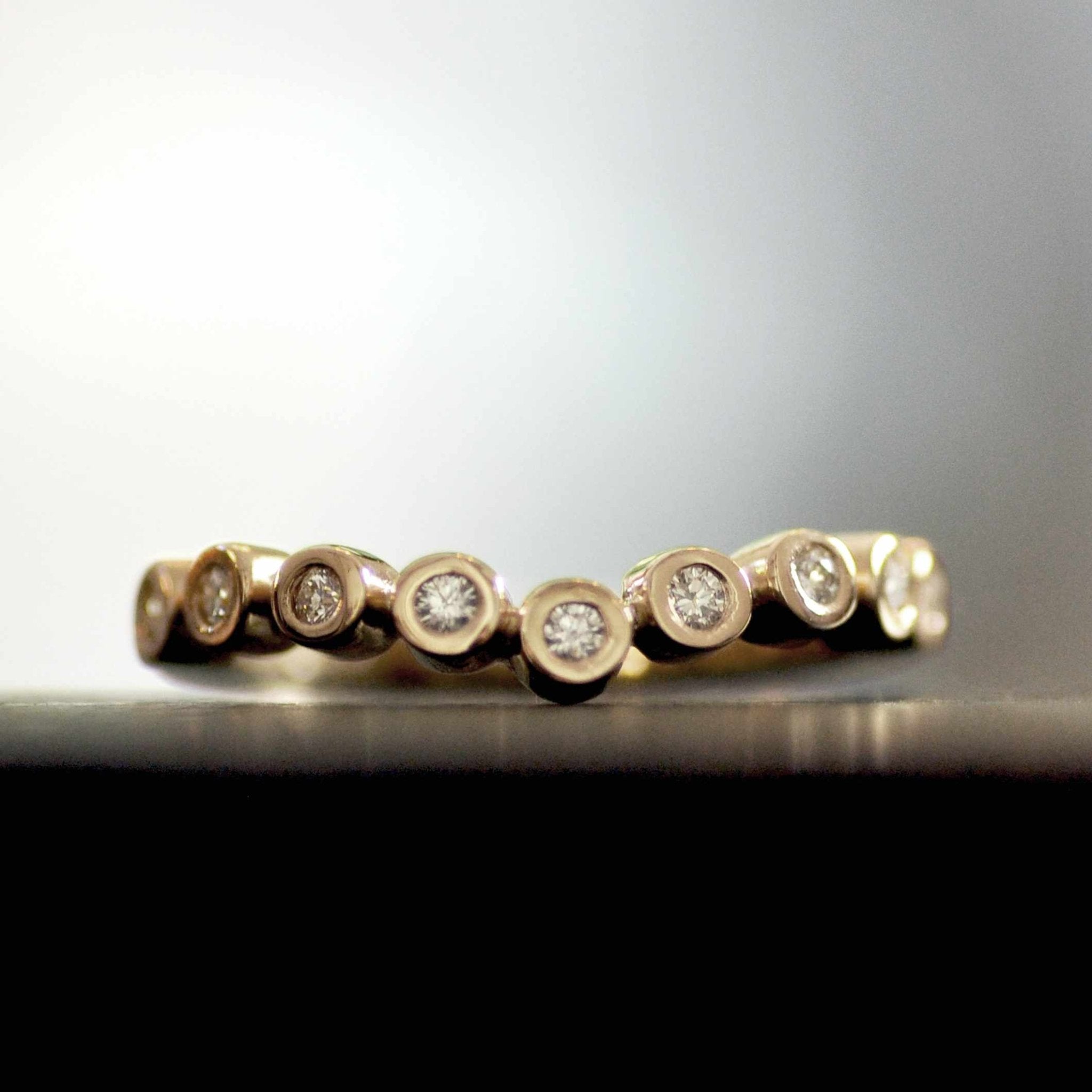 Wedding ring: Small brilliant-cut diamonds in bezel settings arranged in a curve to follow the shape of the engagement ring so they fit together.