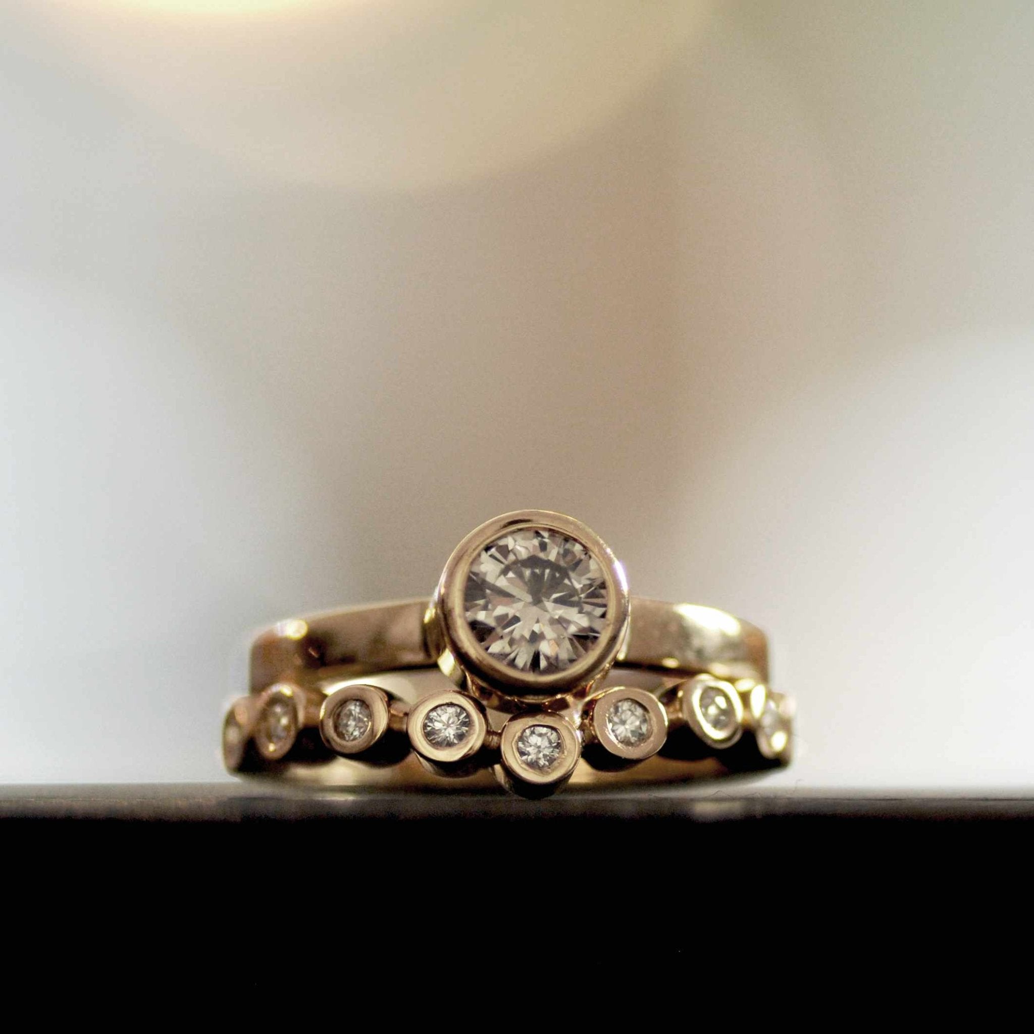 18k gold rings. Engagement ring: Solitaire ring with a larger champagne-colored diamond in a bezel setting.