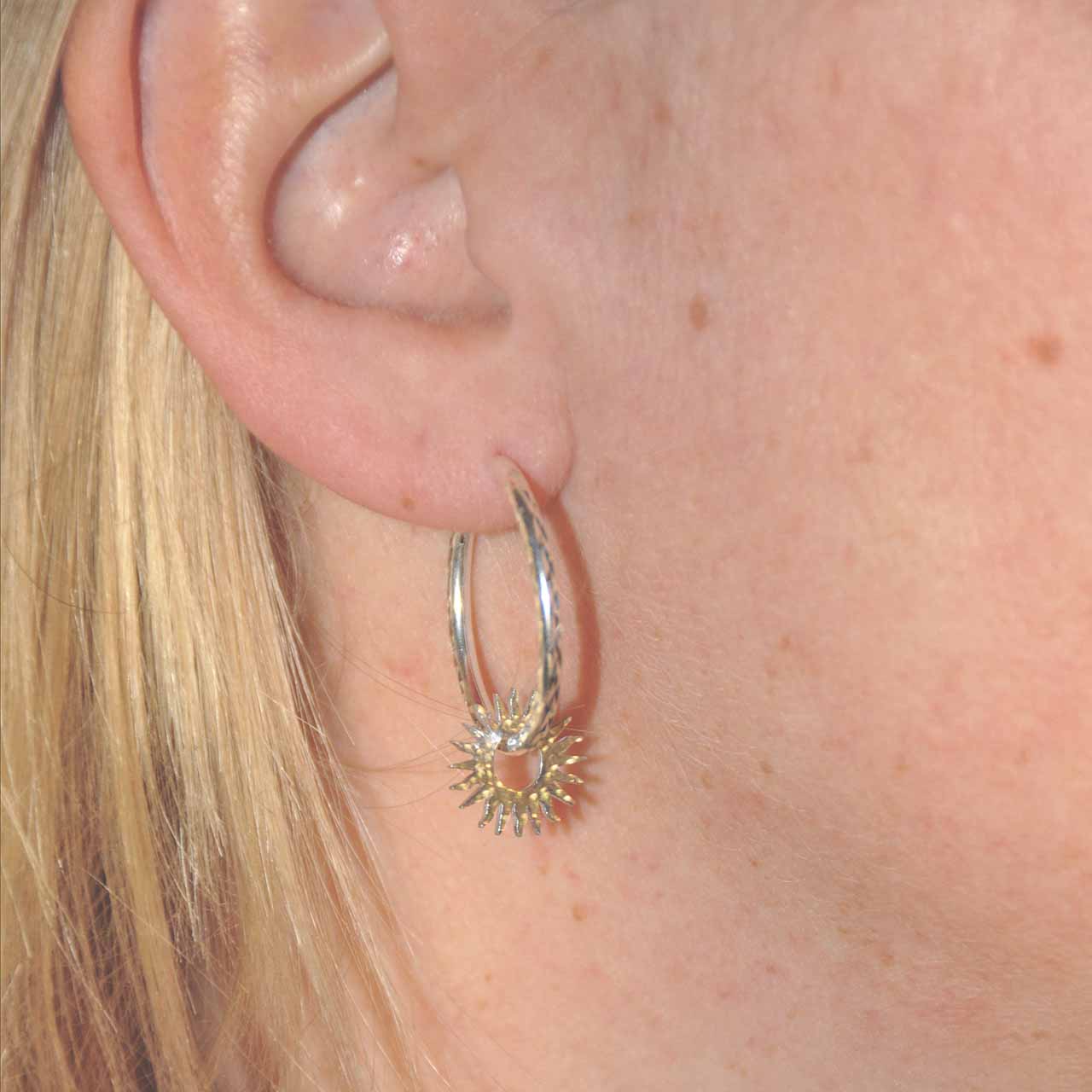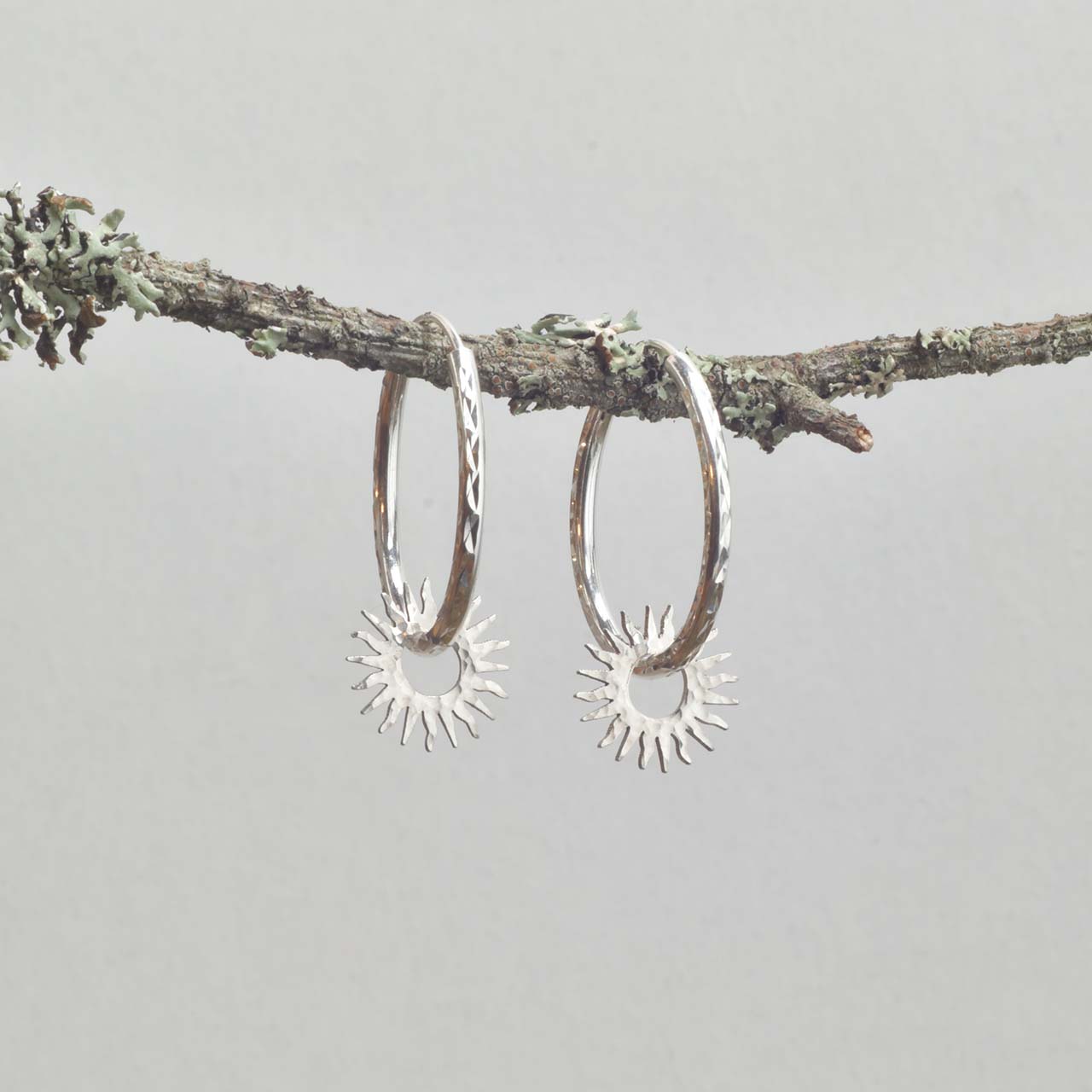 These Sol hoops are designed to capture and reflect the power of the sun. With a hammered surface on the suns and engraved hoops that sparkle like sun rays, every movement catches light and energy from the surroundings. The earrings are a tribute to the sun’s life-giving power and its ability to provide strength and vitality. Perfect for those who want to wear jewelry that radiates energy and power, while also reminding of the sun’s eternal presence.
