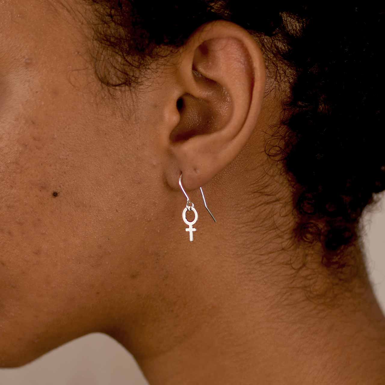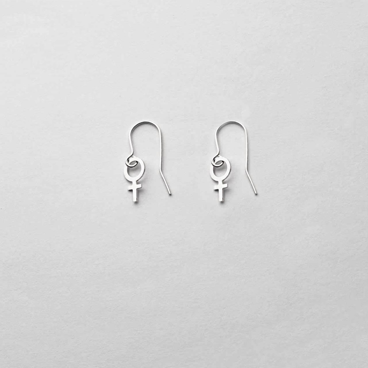 Hook earrings with the female symbol Susan B in recycled silver. Sold in pairs (2 pcs) Length approx. 25mm, of which the female symbol measures 12mm and the hook including the loop from the female symbol up to the ear hole measures 13mm. The included nylon back piece is threaded onto the hook behind the earlobe so the earrings are less likely to fall out of the ear.