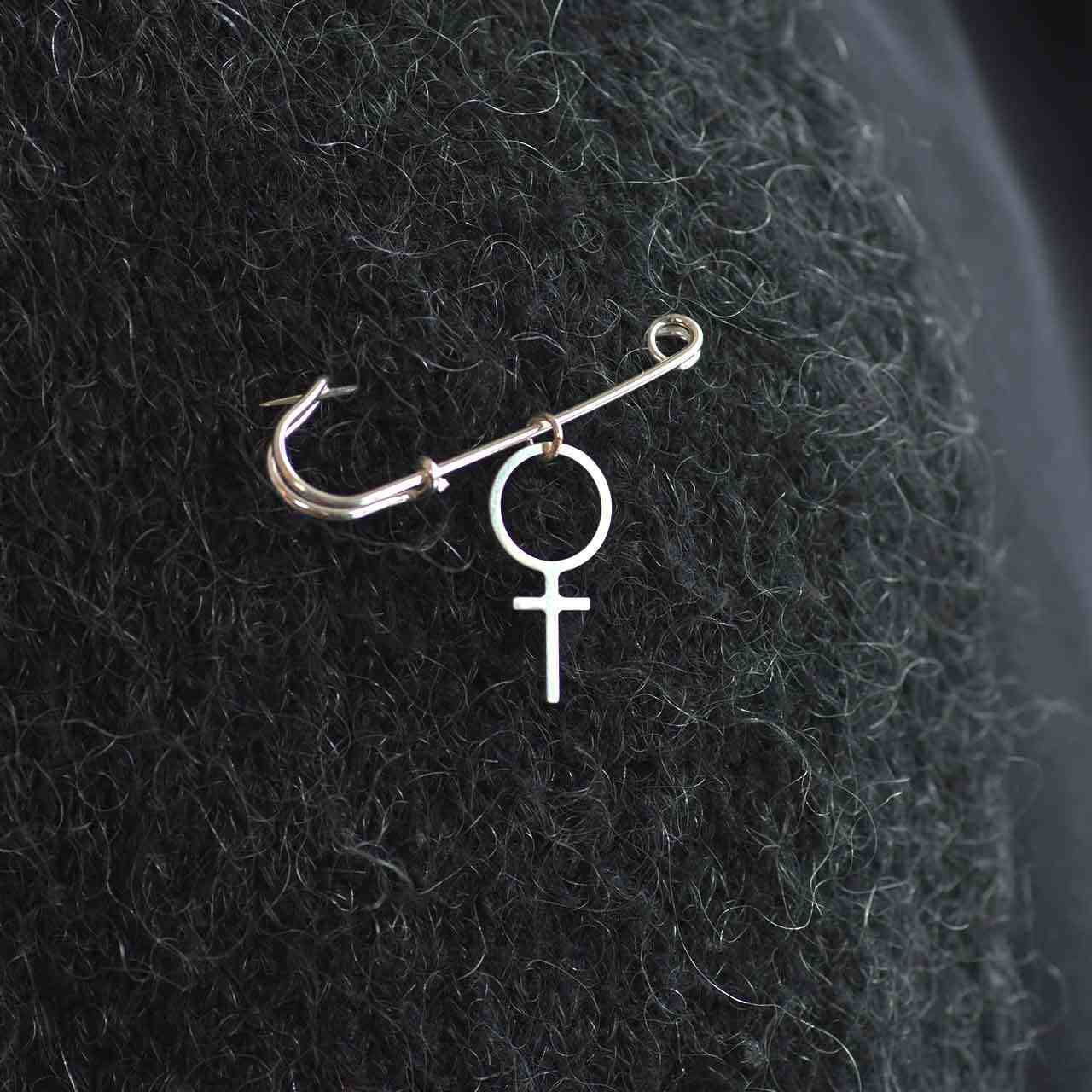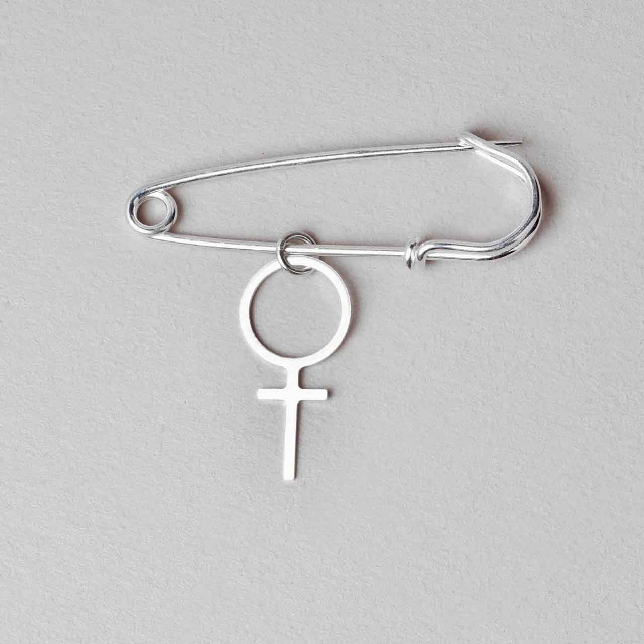 Stor säkerhetsnål i 925 sterling silver med feministhänget Betty. Nålen är stor och passar därför bäst att använda till grovstickade tröjor/sjalar. Också snyggt på jeansjackan! Broschens längd 45mm. Hänget mäter ca 24mm.
