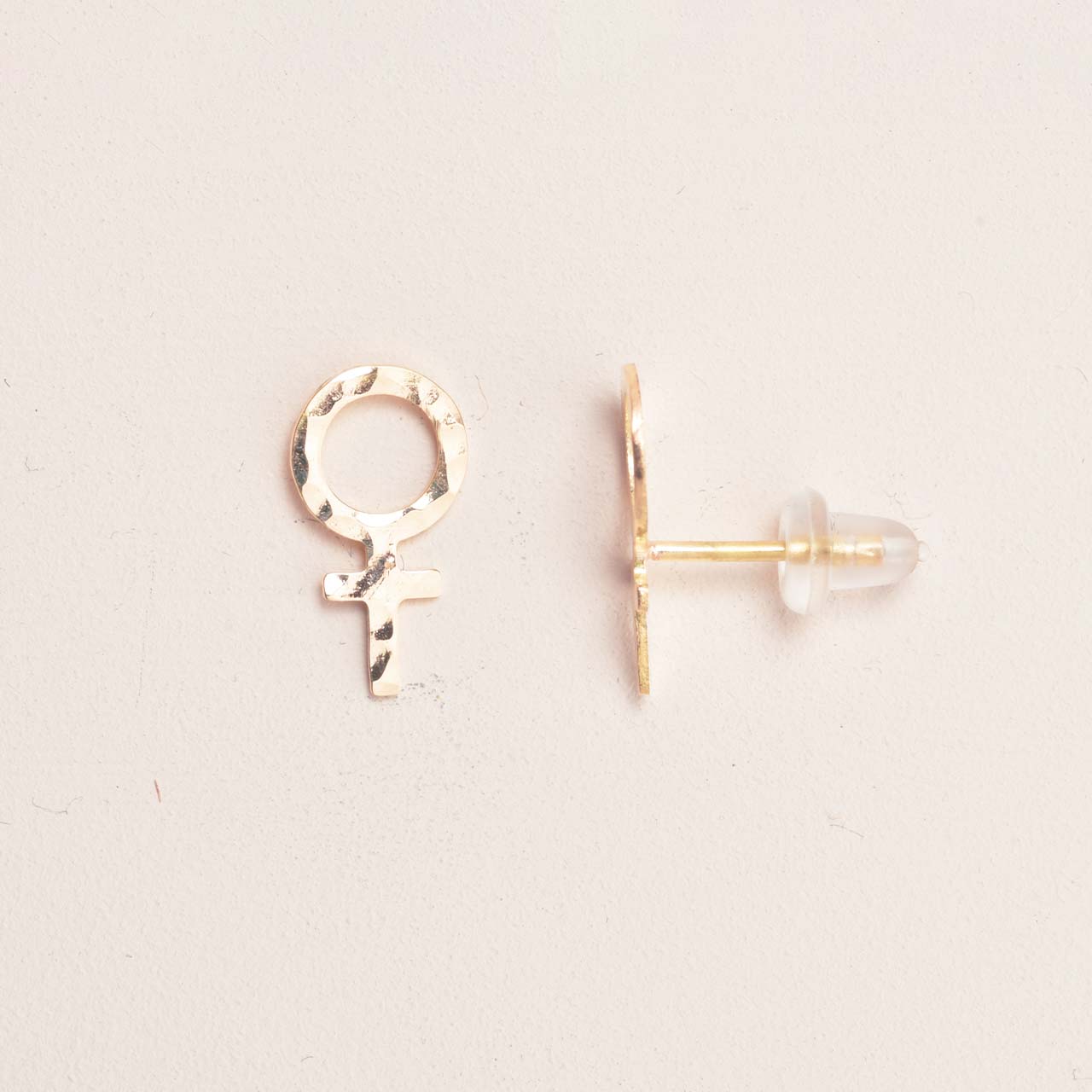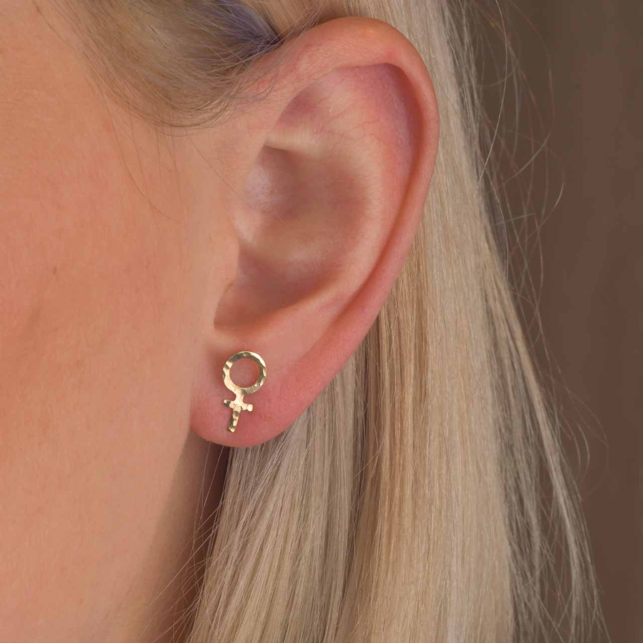 Ett par hamrade feministörhängen i 18k återvunnet guld. Kvinnosymbolen mäter ca 12mm och har en hamrad yta som gör dem levande och skimrande. Säljs med nylonbakstycken.