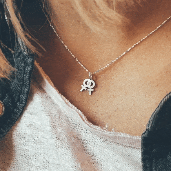 Hängsmycke med dubbla kvinnotecken. Handtillverkad Lesbisk symbol i återvunnet 925 silver som mäter ca 1 cm. Säljes utan kedja. Scrolla ner för att se kedjor som passar till. Pat finns även som örhänge
