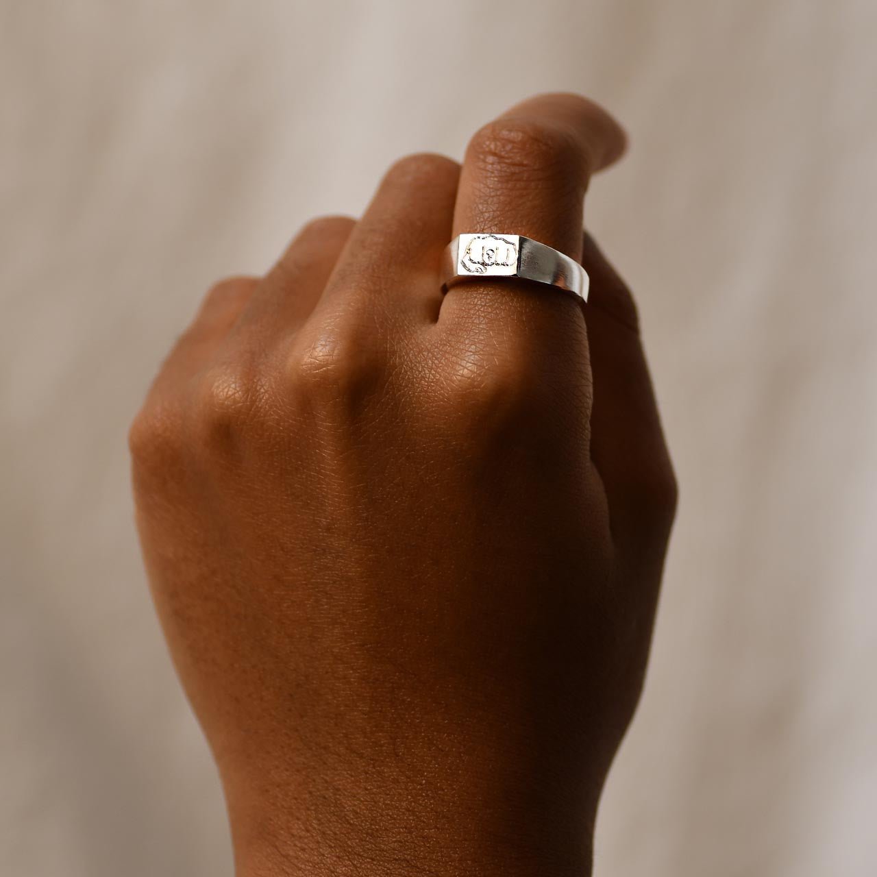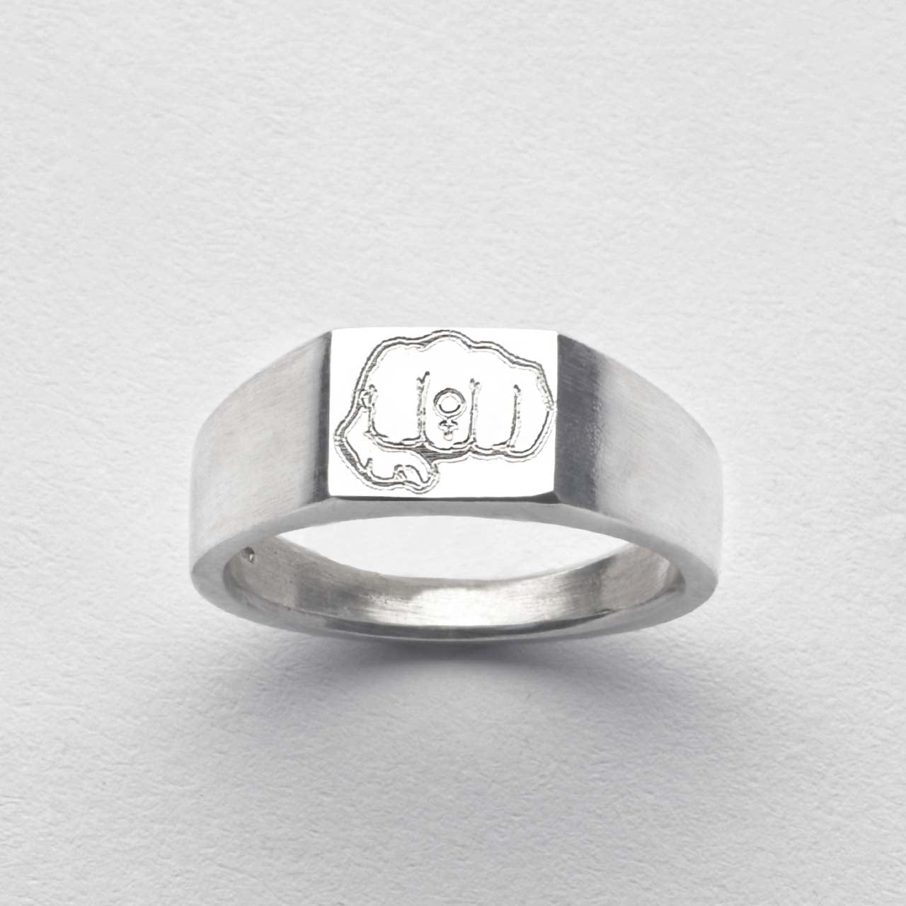 Handtillverkad solid klackring i 925 sterling silver med graverad näve och kvinnotecken. Klackens storlek mäter 7x9 mm.