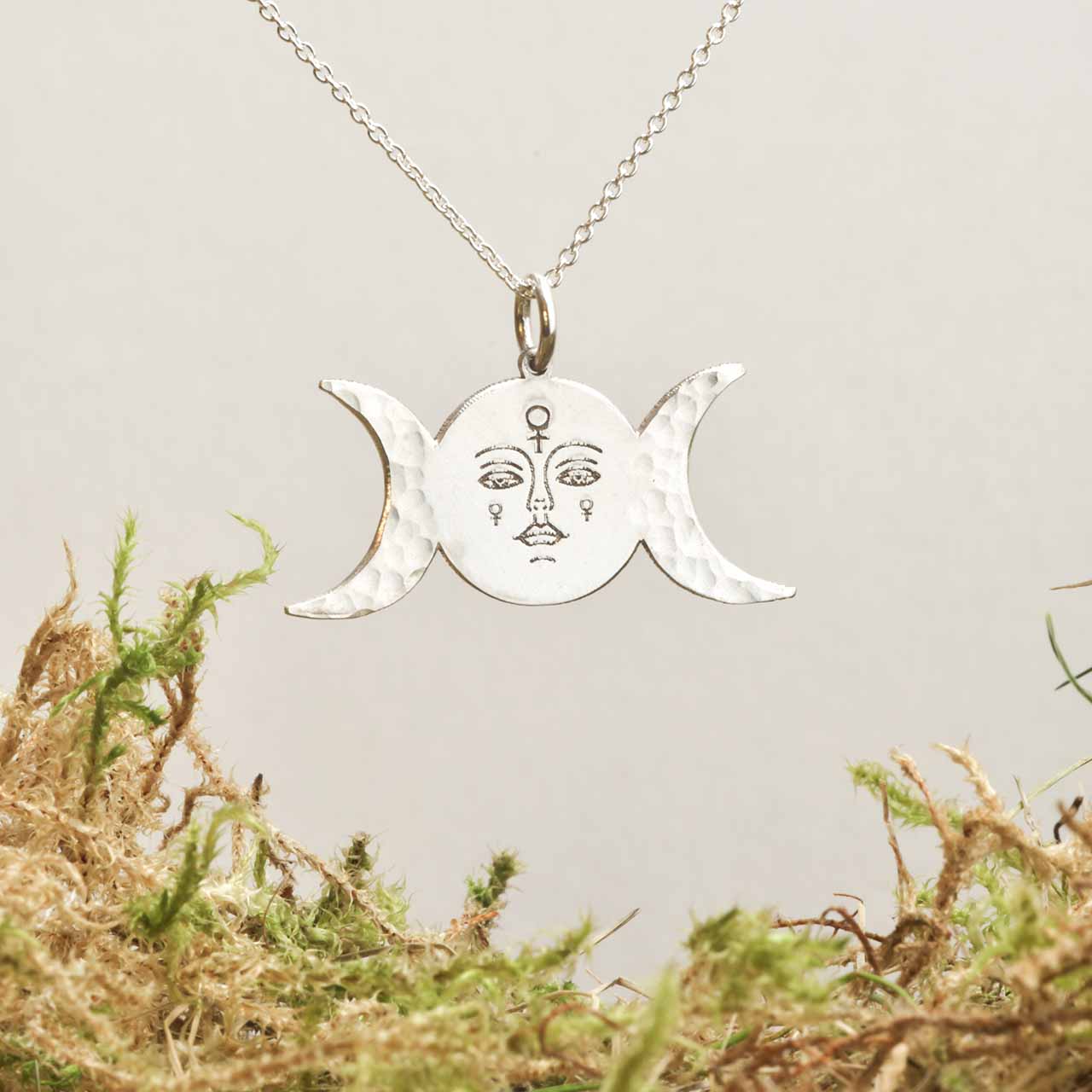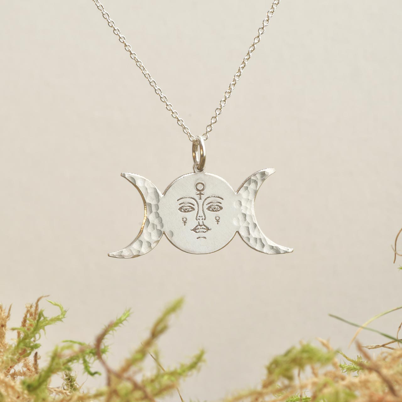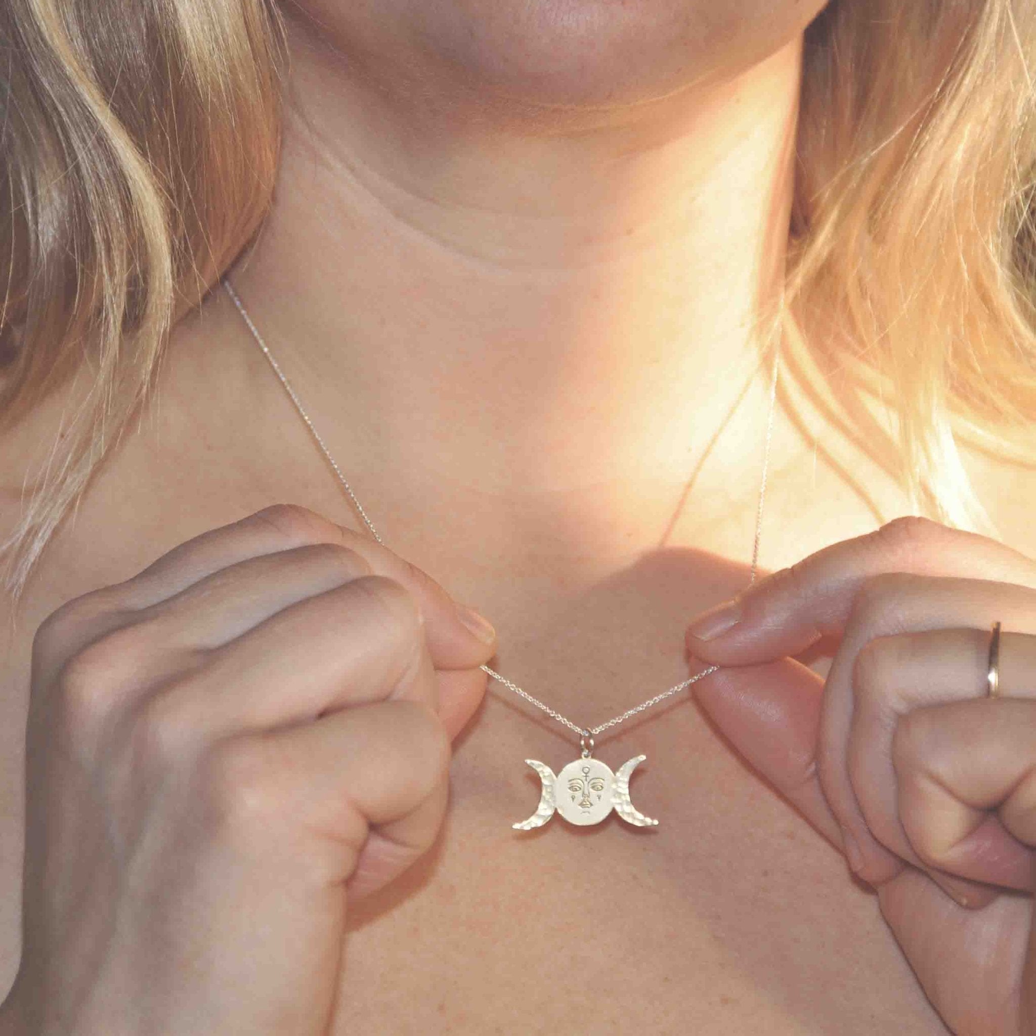 Detta MÅNFASER hängsmycke fångar månens tre faser – nymåne, fullmåne och avtagande måne – och bär med sig en stark koppling till kvinnans inre rytm.