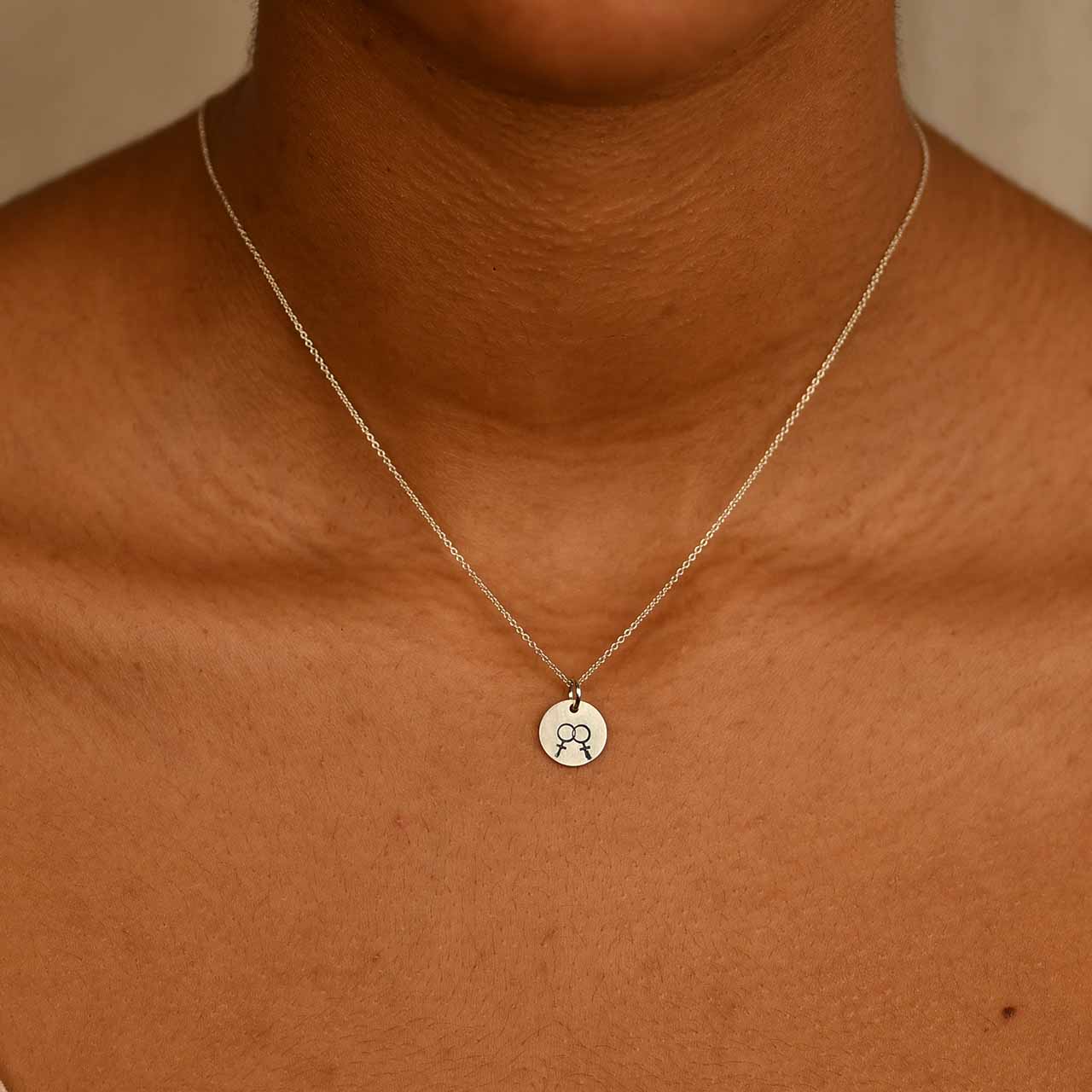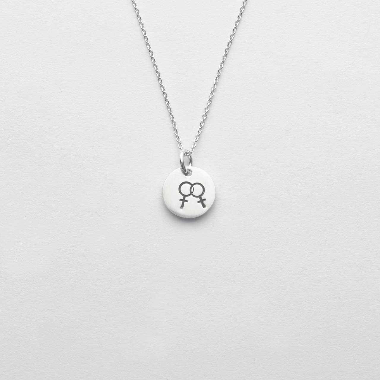 Handtillverkad berlock i 925 sterling silver med två kvinnotecken instansat på ena sidan. Lesbisk symbol. Hänget mäter ca 10mm ø. Utan kedja, lägg till kedja under fliken -Kedjor.