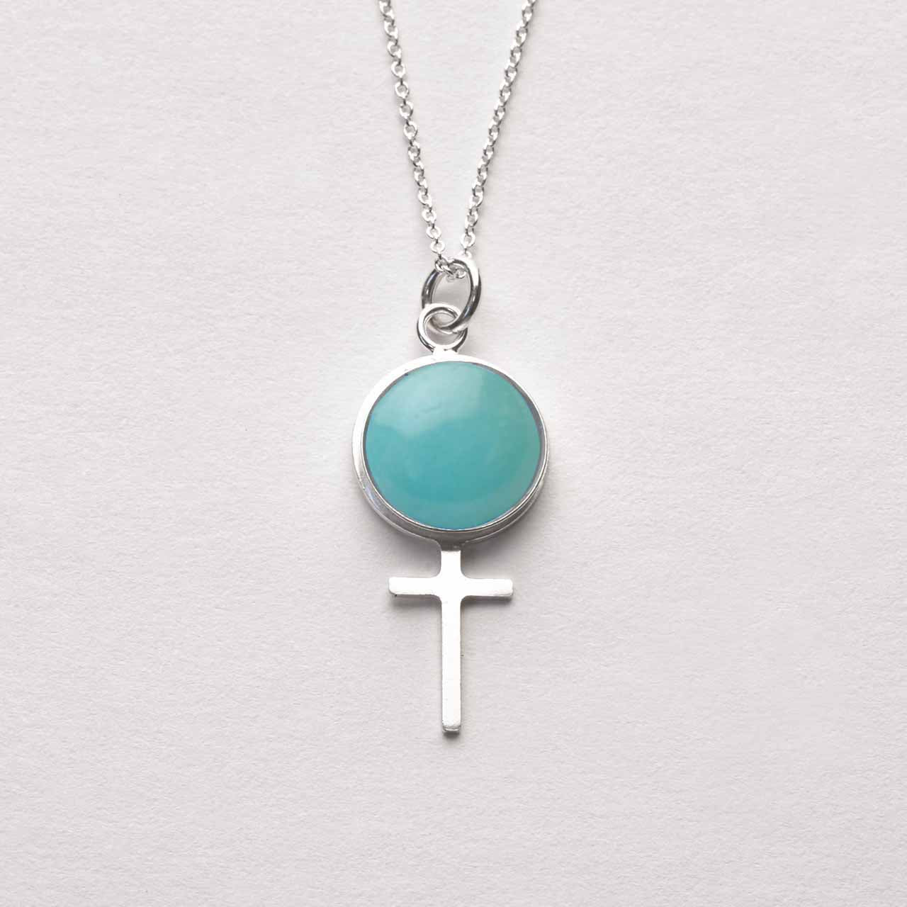 Handtillverkade feministhänge i 925 sterling silver med cabochonslipad amazonit. Ca 24mm. Samma storlek som Betty hänge. Utan kedja. Syns här tillsammans med 1,5mm ø silverkedja. Notera att färgskiftningar i stenen kan förekomma då detta är en naturlig ädelsten. Även färgskillnader kan förekomma.