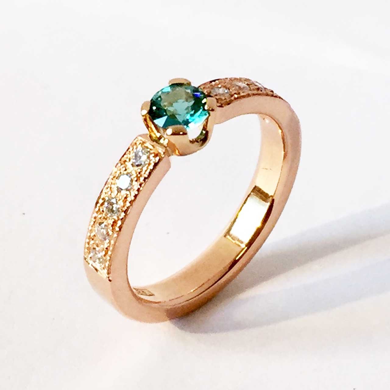 18k guldring med en blågrön spinell som skulle likna Camillas ögonfärg. Och 10 st små briljantslipade diamanter, 5 på varje sida om spinellen.