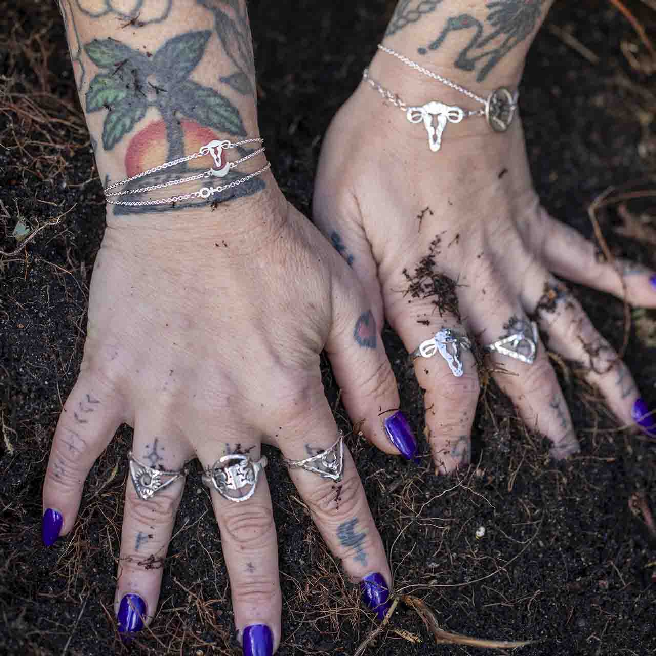 Ormkvinnan ringen är inspirerad av en kraftfull avbildning på en runsten från 400 e.Kr., funnen på Gotland. Stenen visar en kvinna med särade ben, ormar slingrande genom hennes händer – en symbol för både uråldrig kraft och kvinnlig visdom. Dessa smycken fångar essensen av hennes styrka och mystik, där varje detalj är en påminnelse om kvinnans inneboende makt att skapa, förändra och transformera. Ringen symboliserar den cykliska förvandlingen som bäraren genomgår, en ständig rörelse av tillväxt och förnyelse, precis som ormen som ömsar sitt skinn. Handtillverkad i återvunnet 925 sterling silver. Välj storlek i listan. Kan tillverka från strl 16Ø upp till strl 22Ø Var vänlig att mät noga vilken storlek ringen ska ha eftersom alla ringar tillverkas för hand av mig på beställning. Tips! Mät diametern med en linjal tvärsöver ø en tunn ring som passar på det fingret du vill använda den på (insidans kanter) S = ring storlek 16mm ø M = ring storlek 17mm ø L = ring storlek 18-19mm ø XL = ring storlek 20-21mm ø XXL = ring storlek 22mm ø